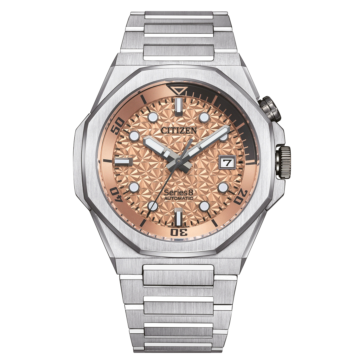 Das Gehäuse hat eine einzigartige dreiteilige Konstruktion mit einer stilvollen achteckigen Lünette für einen auffälligen Look. Das Gehäuse ist sowohl hochglanzpoliert als auch gebürstet und weist komplexe Muster sowie die klaren, geraden Linien auf, die das Markenzeichen der Serie 8 sind.